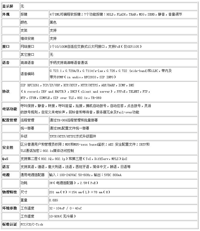GXP1100/1105是功能豐富的公共區(qū)域IP電話系列,支持一個獨立的SIP賬號,兩路通話,4個XML可編程軟按鍵,采用簡潔的無屏設計,通過定制的紙卡標簽為用戶提供關鍵信息和操作提示,使用方法簡單直觀,適用于辦公樓大廳、酒店客房、打印室等公共區(qū)域,為臨時用戶提供方便快捷的服務。GXP1100/1105系列具有優(yōu)異的高清語音質量和豐富完善的電話功能,支持多種語音編碼,可以為用戶的每次通話帶來清晰逼真的語音效果。它廣泛兼容第三方SIP設備及主要的SIP/NGN/IMS平臺,安裝簡單并可以進行批量部署。對于追求性價比的小型企業(yè)、酒店和公共區(qū)域用戶,GXP1100/1105系列IP電話是最理想的選擇。